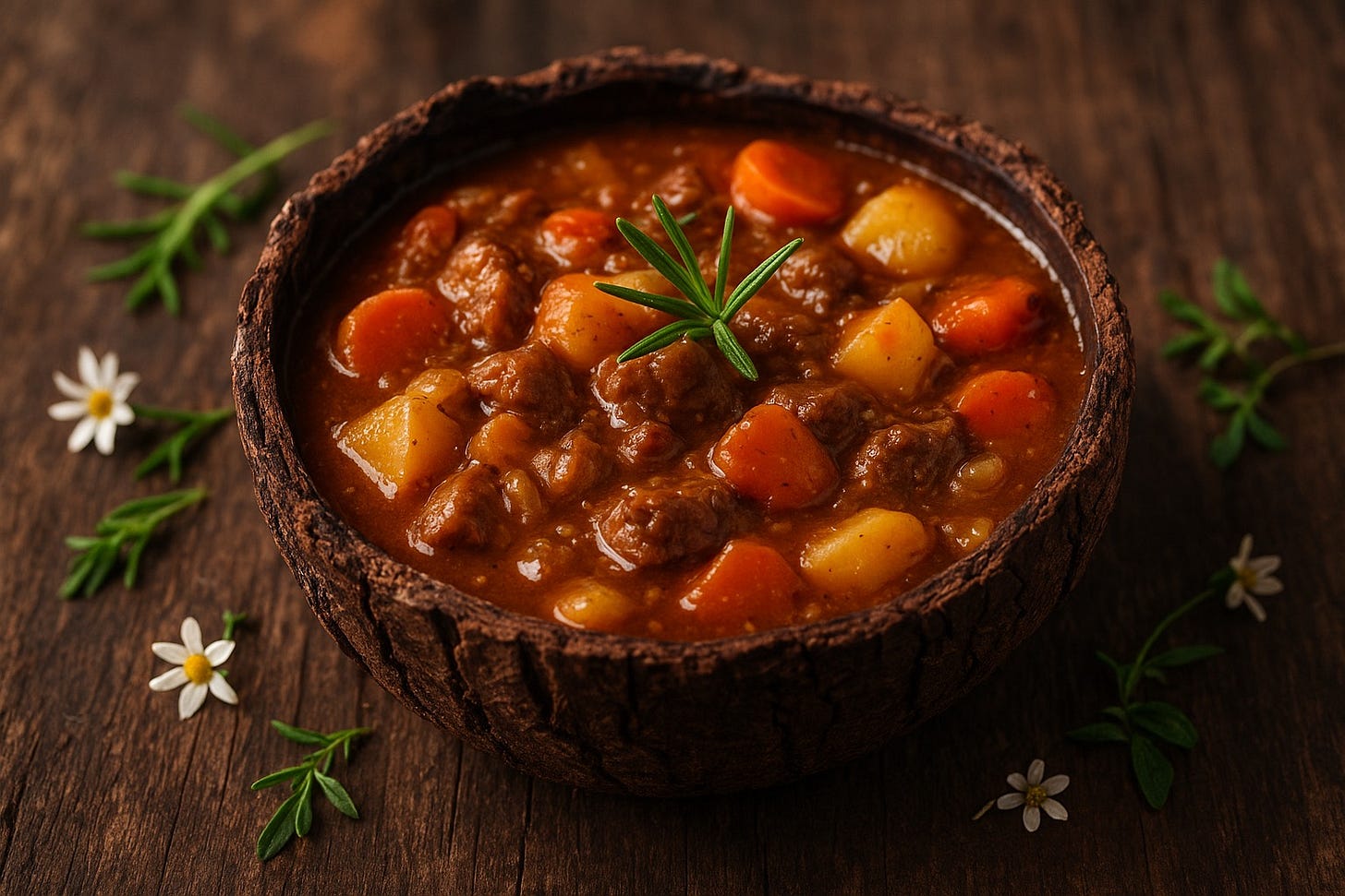 She summoned another bowl—made of bark. Little white flowers and pieces of moss jutted from its cracks. The stew seemed to grow more enticing in this bowl. Potatoes and rosemary. My belly growled.